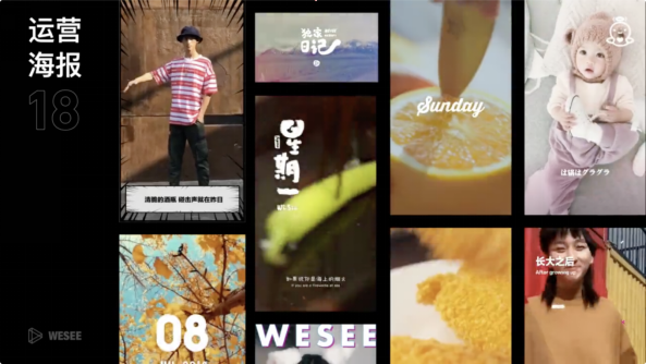 上图为微视的一期运营海报,可以看到在视频编辑场景下包含大量的动效素材。包括动画贴纸,转场特效,以及天气和地理位置等带动画的智能填充文本。