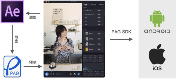设计师使用AE导出插件,能够直接将制作好的动画导出成PAG文件,经过桌面预览工具的确认,再交付给终端由SDK渲染成动效内容。
