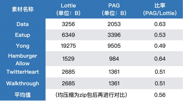 在控制文件大小方面,PAG通过利用动画文件本身的特点,获得了极高的压缩率。除了跳过大量默认值的存储外,PAG在文件的每个属性组里,都会尽可能地把相似的数据重新排列,让他们聚合到一起,目的是绕开字节对齐的问题,使用比特位来紧凑存储。相同的动画内容,通过以上策略的压缩,可以比业内同类型方案平均减少50%左右的文件大小: