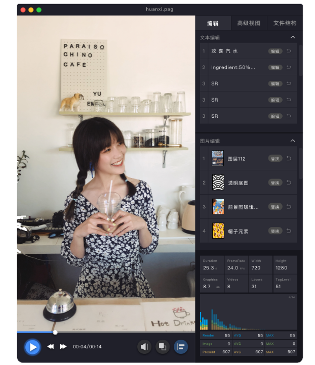 目前,绝大部分的视频编辑App,在贴纸字幕这块的实现都分为两种类型,要么贴纸有丰富的动效,但不可编辑;要么可以编辑文本,但只有静态或者简单的动效,大大束缚了设计师,降低了视频的整体观感。而PAG方案让贴纸有精美动效的前提下,还可以保持强大的编辑性,让使用者的个性化元素得到更好的呈现。