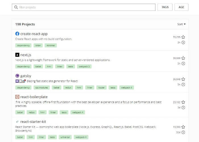 React starter projects 是一个依赖库列表,可以在上面快速你需要要的依赖库的名称并可以跳转对应的 github 上。