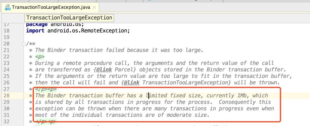 普通的由Zygote孵化而来的用户进程,所映射的Binder内存大小是不到1M的,准确说是 110241024) - (4096 *2) :这个限制定义在frameworks/native/libs/binder/processState.cpp类中,如果传输说句超过这个大小,系统就会报错,因为Binder本身就是为了进程间频繁而灵活的通信所设计的,并不是为了拷贝大数据而使用的: