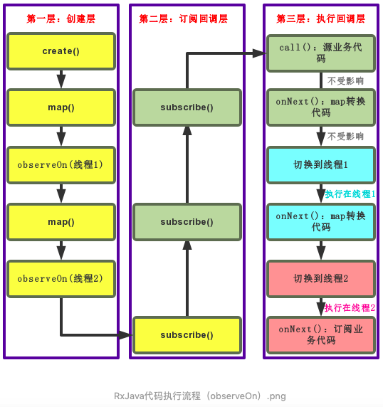 observeOn()产生的线程切换都发生在第三层执行层,而在切换线程前的业务代码由于已经执行了,故不受切换线程切换的影响。