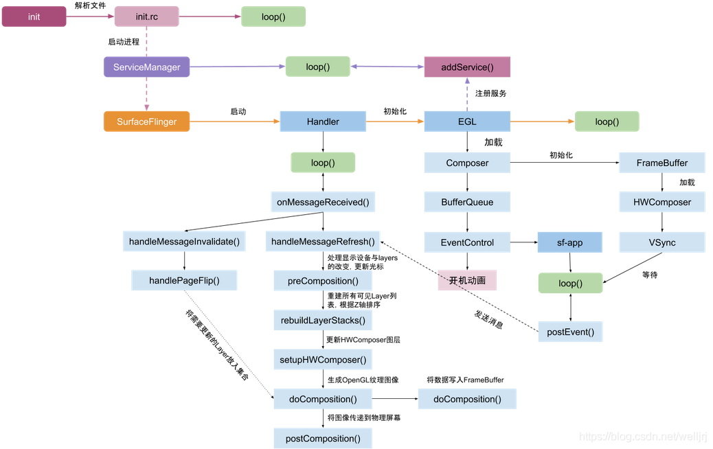 - 第四阶段:swapBuffers,并通知SurfaceFlinger图层合成