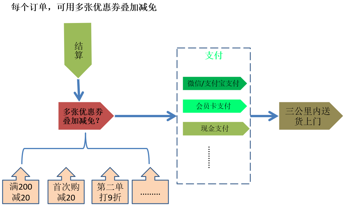 在上一节策略模式中,每个顾客可以选择不同的打折策略,但是通常有些顾客是符合多个打折策略的,那么如何将多个打折策略结合到一起使用呢?责任链模式提供了很好的解决方式: