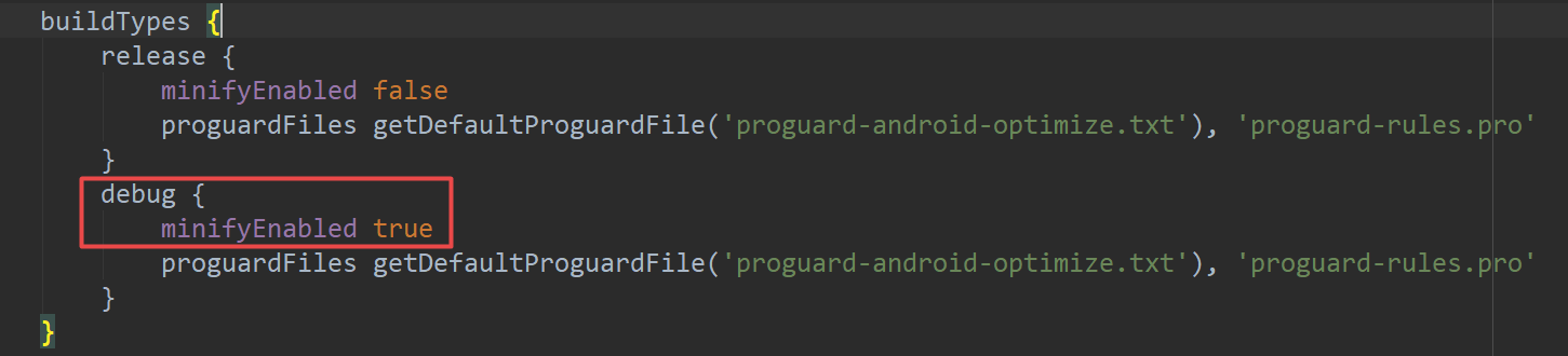 在build.gradle文件中默认的Proguard文件配置是false关闭的,我们可以在debug模式下打开,设置为true即可:
