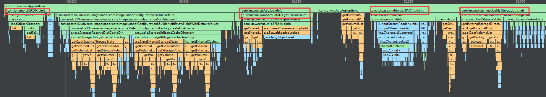 如图所示,我们可以清楚的看到在onCreate中每个初始化函数的耗时时间,我么只需要依次分析下耗时较多的函数里面是否是必须要在onCreate中完成的,如果是非必须的,我们可以开启线程或者放到后面一些执行,以免影响应用启动耗时: