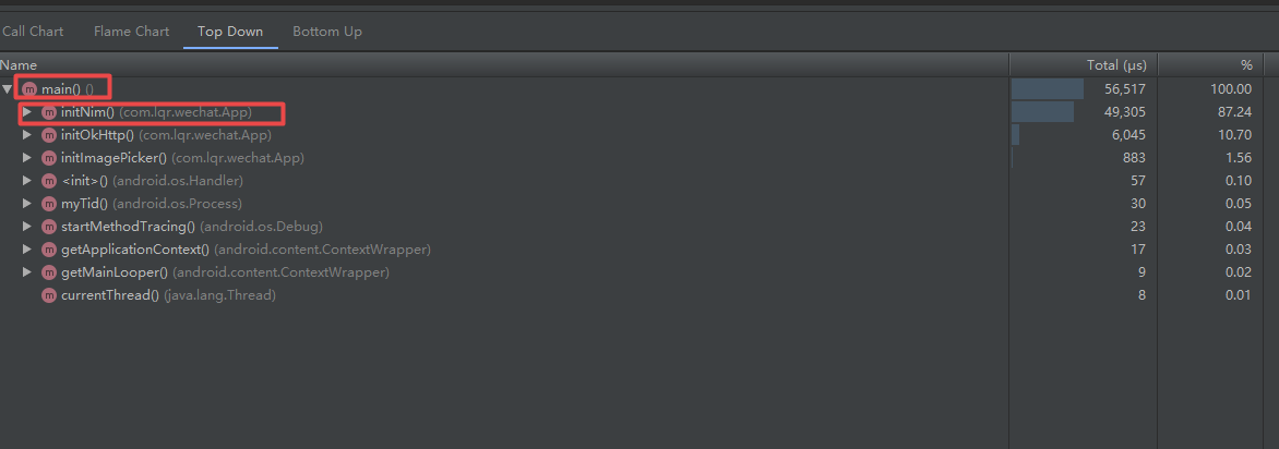 可以非常清楚看到onCreate初始化总耗时56ms,其中的intiNIM函数就占了49ms,占比87%,因此我们后面集中精力优化下这个初始化函数,把不必要的操作移动到后面进行,以免它的初始化占用了过多的启动时间。