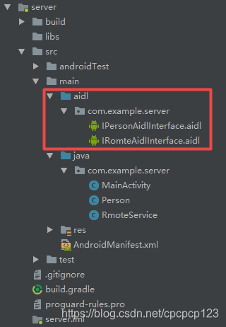 我们知道AIDL是跨进程通信,那么肯定是在两个进程中,我们这里创建两个工程,分别作为server端和client端,整个项目的目录结构如图: