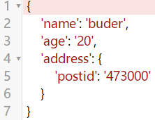 {'name':'buder','age':'20', 'address':{'postid':'473000'}}
