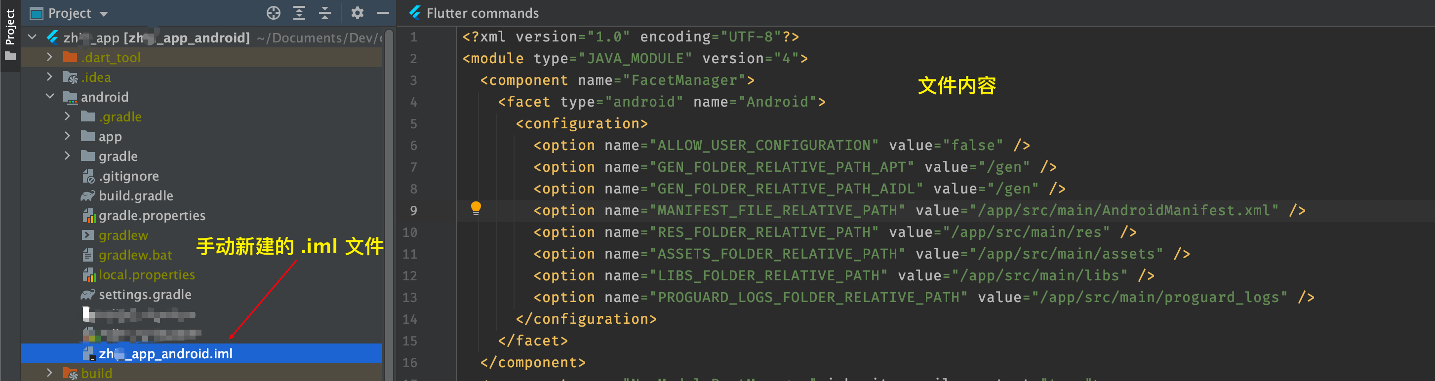 在 android 文件夹下手动创建一个 xxx_android.iml 的文件,xxx 代表文件名,虽然可以指定为任意符合命名规范的字符,但一般会把 Flutter 项目的名字作为文件名,