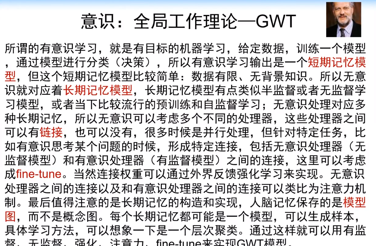 - 最后值得注意的是长期记忆的构造和实现,人脑记忆保存的是模型图,而不是概念图。每个长期记忆都可能是一个模型,可以生成样本, 具体学习方法,可以想象一下是一个层次聚类。通过这样就可以用有监督、无监督、强化、注意力、fine-tune来实现GWT模型。