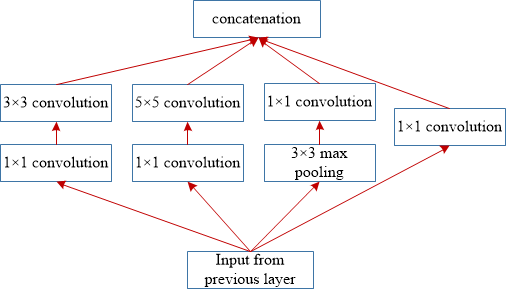 4.1.5 GoogleNetGoogleNet was the winner of the 2014-ILSVRC competition and is also known as Inception-V1. The main objective of the GoogleNet architecture was to achieve high accuracy with a reduced computational cost [99]. It introduced the new concept of inception block in CNN, whereby it incorporates multi-scale convolutional transformations using split, transform, and merge idea. The architecture of inception block is shown in Fig. 6. This block encapsulates filters of different sizes (1x1, 3x3, and 5x5) to capture spatial information at different scales (both at fine and coarse grain level). In GoogleNet, conventional convolutional layers are replaced in small blocks similar to the idea of substituting each layer with micro NN as proposed in Network in Network (NIN) architecture [57]. The exploitation of the idea of split, transform, and merge by GoogleNet, helped in addressing a problem related to the learning of diverse types of variations present in the same category of different images. In addition to the improvement in learning capacity, GoogleNet focus was to make CNN parameter efficient. GoogleNet regulates the computation by adding a bottleneck layer with a 1x1 convolutional filter, before employing large size kernels. It used sparse connections (not all the output feature maps are connected to all the input feature maps), to overcome the problem of redundant information and reduced cost by omitting feature maps (channels) that were not relevant. Furthermore, connection’s density was reduced by using global average pooling at the last layer, instead of using a fully connected layer. These parameter tunings caused a significant decrease in the number of parameters from 40 million to 5 million parameters. Other regulatory factors applied were batch normalization and use of RmsProp as an optimizer [129]. GoogleNet also introduced the concept of auxiliary learners to speed up the convergence rate. However, the main drawback of the GoogleNet was its heterogeneous topology that needs to be customized from module to module. Another, limitation of GoogleNet was a representation bottleneck that drastically reduces the feature space in the next layer and thus sometimes may lead to loss of useful information.