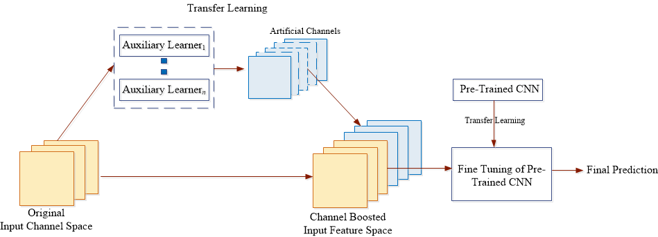 4.6 Channel(Input) Exploitation based CNNs Image representation plays an important role in determining the performance of the image- processing algorithms including both conventional and deep learning algorithms. A good representation of the image is one that can define the salient features of an image from a compact code. In literature, various types of conventional filters are applied to extract different levels of information for a single type image [157], [158]. These diverse representations are then used as an input of the model to improve performance [159], [160]. Now CNN is an effective feature learner that can automatically extract discriminating features depending upon the problem [161]. However, the learning of CNN relies on input representation. The lack of diversity and absence of class discernable information in the input may affect CNN performance as a discriminator. For this purpose, the concept of channel boosting (input channel dimension) using auxiliary learners is introduced in CNN to boost the representation of the network [36]. 4.6.1 Channel Boosted CNN using TL In 2018, Khan et al. proposed a new CNN architecture named as Channel boosted CNN (CB- CNN) based on the idea of boosting the number of input channels for improving the representational capacity of the network [36]. Block diagram of CB-CNN is shown in Fig. 11. Channel boosting is performed by artificially creating extra channels (known as auxiliary channels) through deep generative models and then exploiting it through the deep discriminative models. It provides the concept that TL can be used at both generation and discrimination stages. Data representation plays an important role in determining the performance of a classifier, as different representations may present different aspects of information [84]. For improving the representational potential of the data, Khan et al. exploited the power of TL and deep generative learners [24], [162], [163]. Generative learners attempt to characterize the data generating distribution during the learning phase. In CB-CNN, autoencoders are used as a generative learner to learn explanatory factors of variation behind the data. The concept of inductive TL is used in a novel way to build a boosted input representation by augmenting learned distribution of the input data with the original channel space (input channels). CB-CNN encodes channel-boosting phase into a generic block, which is inserted at the start of a deep Net. For training, Khan et al. used a pre-trained network, to reduce computational cost. The significance of the study is that multi- deep learners are used where generative learning models are used as auxiliary learners that enhance the representational capacity of deep CNN based discriminator. Although the potential of the channel boosting was only evaluated by inserting boosting block at the start, however, Khan et al. suggested that this idea can be extended by providing auxiliary channels at any layer in the deep architecture. CB-CNN has also been evaluated on medical image dataset, where it also shows improved results compared to previously proposed approaches. The convergence plot of CB-CNN on mitosis dataset is shown in Fig. 12.Fig. 11: Basic architecture of CB-CNN.