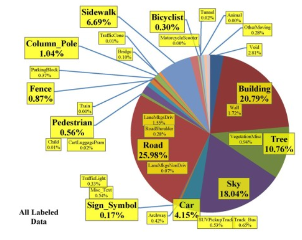 Cambridge-driving Labeled Video Database (CamVid)。CamVid是第一个具有目标类别语义标签的视频集合。数据库提供32个ground truth语义标签,将每个像素与语义类别之一相关联。该数据库解决了对实验数据的需求,以定量评估新兴算法。数据是从驾驶汽车的角度拍摄的,驾驶场景增加了观察目标的数量和异质性。 Cambridge-driving标签视频数据库(CamVid)是第一个包含对象类语义标签的视频集合,其中包含元数据。该数据库提供了ground truth标签,将每个像素与32个语义类中的一个关联起来。该数据库解决了对实验数据的需求,以定量评估新兴算法。虽然大多数视频都是用固定位置的cctv式摄像机拍摄的,但我们的数据是从驾驶汽车的角度拍摄的。驱动场景增加了观察对象的数量和异构性。 提供超过10分钟的高质量30Hz连续镜头,对应的语义标记图像为1Hz,部分为15Hz。CamVid数据库提供了与对象分析研究人员相关的四个贡献。首先手动指定700多幅图像的逐像素语义分割,然后由第二个人检查并确认其准确性。其次,数据库中高质量、高分辨率的彩色视频图像对那些对驾驶场景或自我运动感兴趣的人来说,是有价值的长时间数字化视频。第三,我们拍摄了相机颜色响应和内部物理的标定序列,并计算了序列中每一帧的三维相机姿态。最后,为了支持扩展这个或其他数据库,我们提供了定制的标签软件,帮助用户为其他图像和视频绘制精确的类标签。我们通过测量算法在三个不同领域的性能来评估数据库的相关性:多类目标识别、行人检测和标签传播。