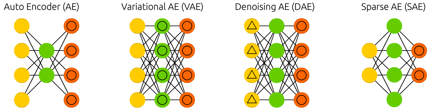 Sparse autoencoders (SAE) are in a way the opposite of AEs. Instead of teaching a network to represent a bunch of information in less “space” or nodes, we try to encode information in more space. So instead of the network converging in the middle and then expanding back to the input size, we blow up the middle. These types of networks can be used to extract many small features from a dataset. If one were to train a SAE the same way as an AE, you would in almost all cases end up with a pretty useless identity network (as in what comes in is what comes out, without any transformation or decomposition). To prevent this, instead of feeding back the input, we feed back the input plus a sparsity driver. This sparsity driver can take the form of a threshold filter, where only a certain error is passed back and trained, the other error will be “irrelevant” for that pass and set to zero. In a way this resembles spiking neural networks, where not all neurons fire all the time (and points are scored for biological plausibility). 稀疏自编码器(SAE)在某种程度上与AEs相反。我们不是教网络在更小的“空间”或节点中表示一堆信息,而是尝试在更大的空间中编码信息。所以我们不是把网络收敛到中间然后再扩展到输入大小,而是把中间放大。这些类型的网络可用于从数据集中提取许多小特性。如果用与AE相同的方法训练SAE,那么几乎在所有情况下,您都会得到一个非常无用的身份网络(就像输入就是输出一样,没有任何转换或分解)。为了防止这种情况发生,我们不是返回输入,而是返回输入加上一个稀疏驱动程序。这种稀疏驱动程序可以采用阈值筛选器的形式,在阈值筛选器中,只有一个特定的错误被传递回去并进行训练,而另一个错误将与该传递“无关”,并被设置为零。在某种程度上,这类似于尖峰状的神经网络,不是所有的神经元都一直处于兴奋状态(并根据生物学上的合理性打分)。