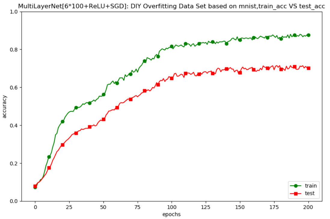 DL之DNN:利用MultiLayerNet模型【6*100+ReLU+SGD】对Mnist数据集训练来理解过拟合现象