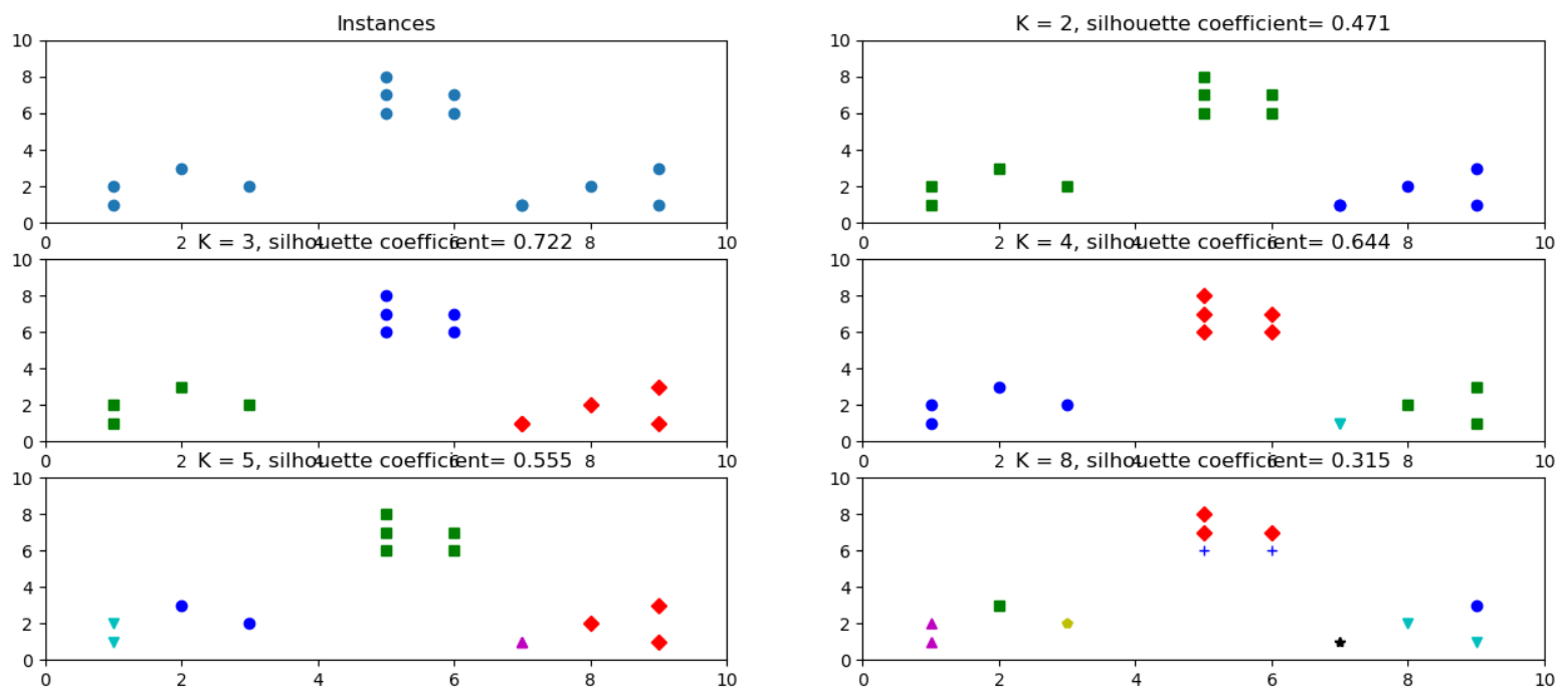 plt.title('K = %s, silhouette coefficient= %0.03f' %(t, sc_score))
