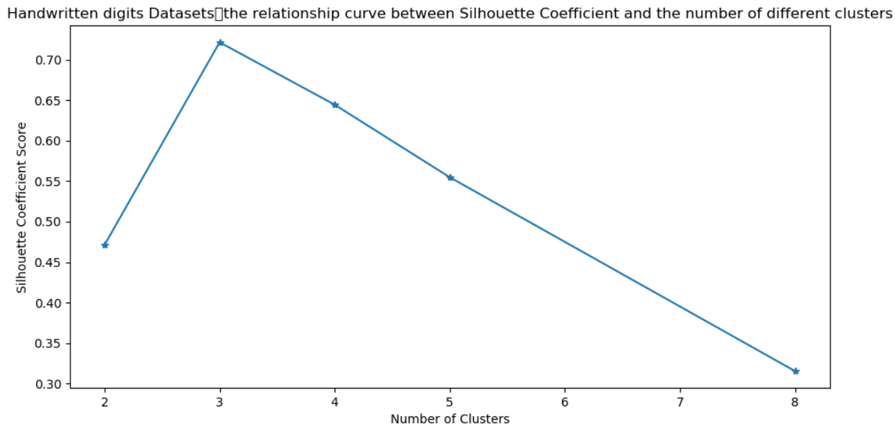 plt.title('Handwritten digits Datasets:the relationship curve between Silhouette Coefficient and the number of different clusters')