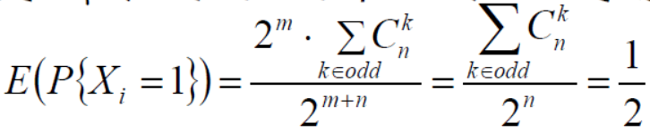 2、从1,2,3,......,98,99,2015这100个数中任意选择若干个数(可能为0个数)求异或,试求异或的期望值。 解:计算每一位的期望。针对任何一个二进制位:取奇数个1异或后会得到1,取偶数个1异或后会得到0;与取0的个数无关。 给定的最大数2015=(11111011111)2,共11位。针对每一位分别计算,考虑第 i 位Xi,假定给定的100个数中第 i 位一共有N个1,M个0,某次采样取到的1的个数为k。则有