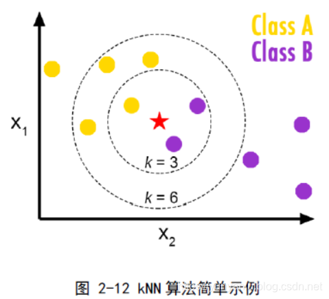 kNN算法的核心思想:如果一个样本在特征空间中的k个最相邻的样本中的大多数属于某一个类别,则该样本也属于这个类别,并具有这个类别上样本的特性。
