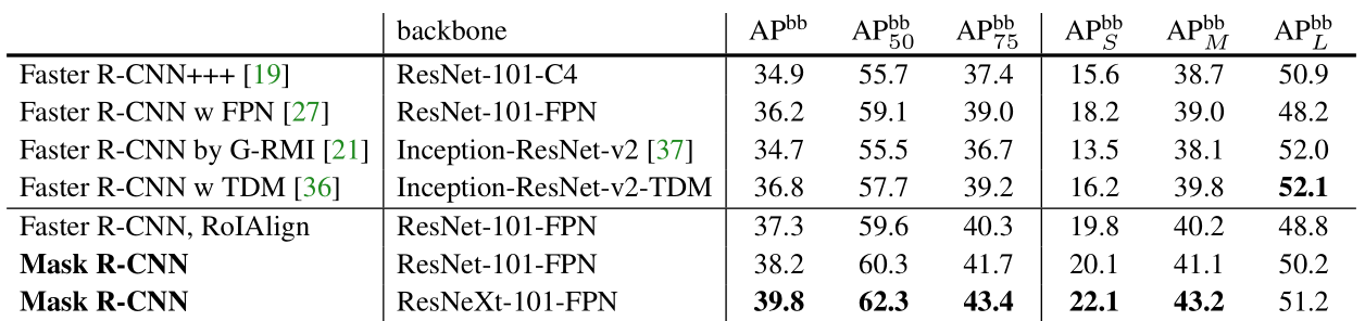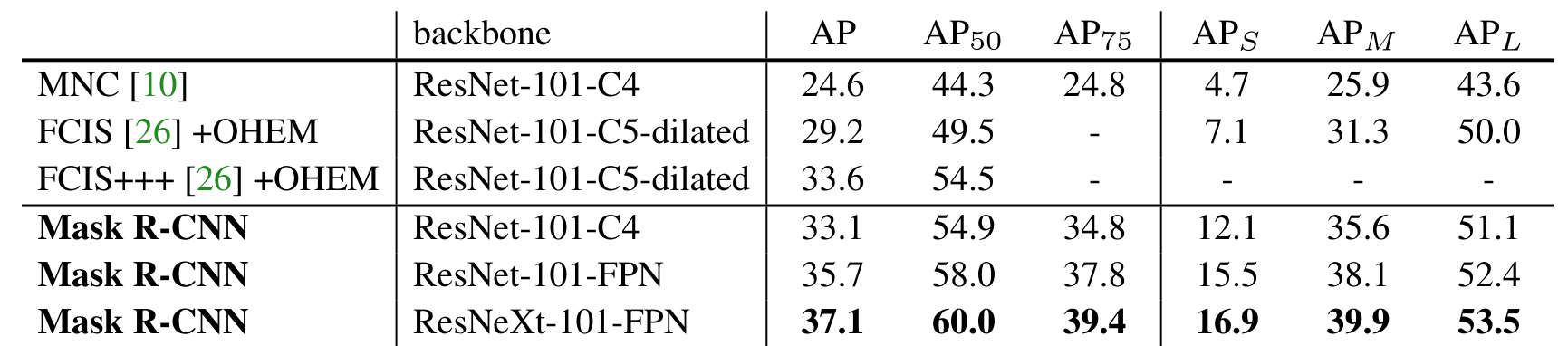 Object Detection Results on COCO 使用ResNet-101-FPN的Mask R-CNN优于所有先前最先进模型的基本变体。 Mask R-CNN using ResNet-101-FPN outperforms the base variants of all previous state-of-the-art models