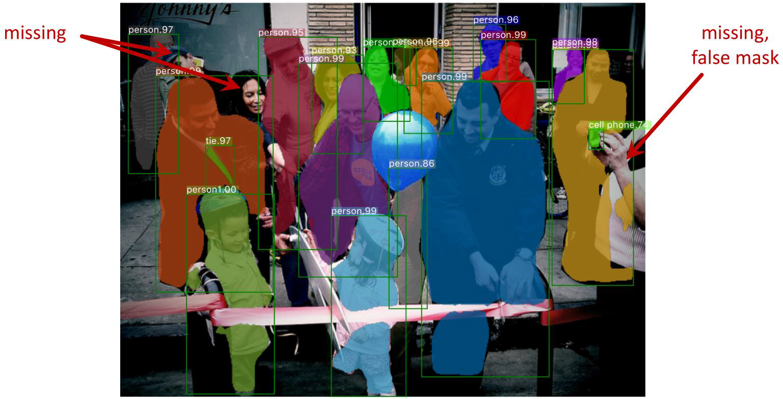 使用ResNet-101-FPN在COCO 测试图像上Mask R-CNN,并以5 fps的速度运行,使用35.7 mask ap Mask R-CNN on COCO test images, using ResNet-101-FPN and running at 5 fps, with 35.7 mask AP