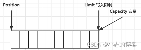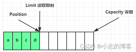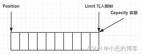 - 初始化时,position 表示起始下标,limit 表示写入限制,capacity表示容量,如下图所示: