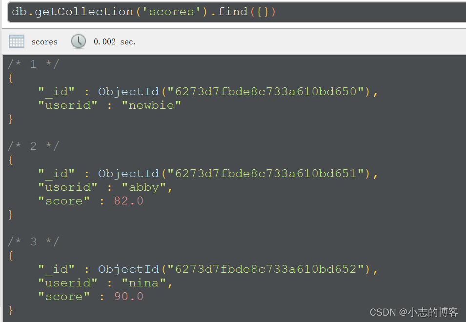 db.scores.insertMany([ {"userid" : "newbie"}, {"userid" : "abby", "score" : 82}, {"userid" : "nina", "score" : 90} ]) -