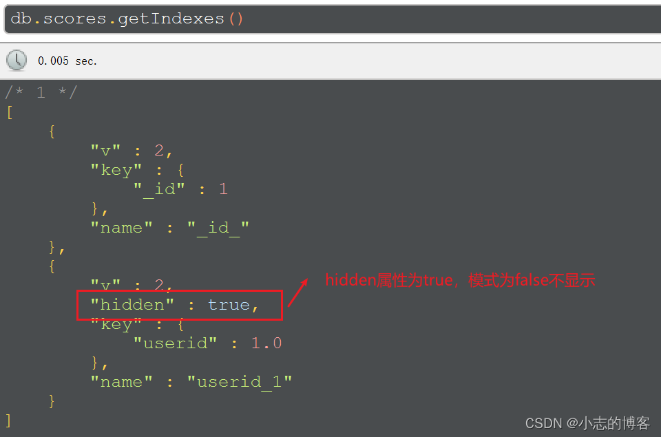 创建隐藏索引(创建单键索引并指定hidden属性为true)