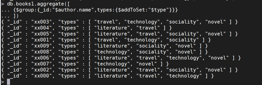 db.books1.aggregate([ {$group:{_id:"$author.name",types:{$addToSet:"$type"}}} ]) -