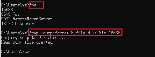 jmap -dump:format=b,file=d:\a.bin 16688 -