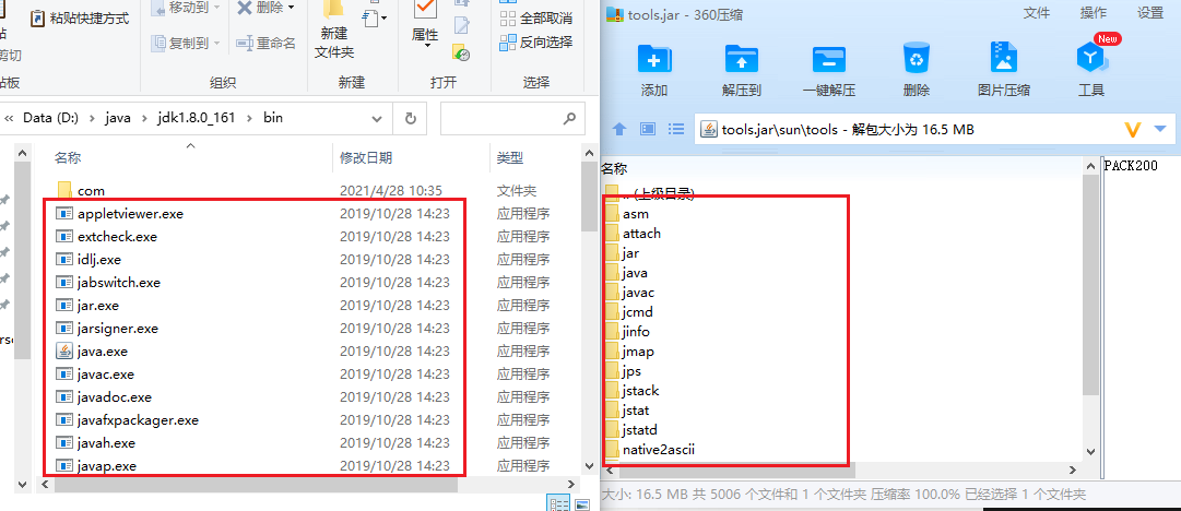 这些命令行工具大多数都是jdk/lib/tools.jar类库的一层薄包装而已,它们主要的功能代码是在tools类库中实现的。如下图对比一下就可以看得很清楚。