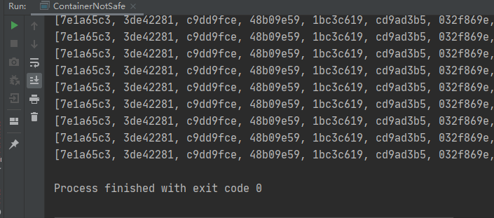 import java.util.*; /** * @description: HashSet线程不安全的代码示例 * @author: xz */ public class ContainerNotSafe { public static void main(String[] args) { Set set=new HashSet(); //模拟30个线程,往HashSet集合中添加数据 for(int i=1;i{ set.add(UUID.randomUUID().toString().substring(0,8)); System.out.println(set); }).start(); } } } -