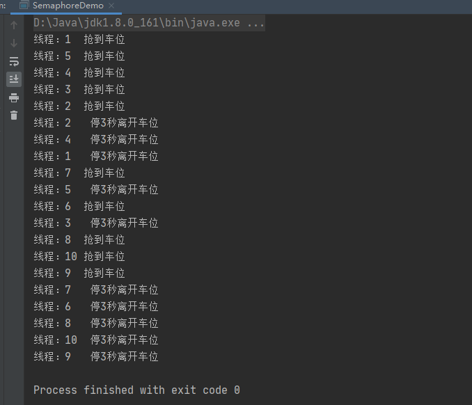 import java.util.concurrent.Semaphore; import java.util.concurrent.TimeUnit; /** * @description: 抢车位案例 * @author: xz */ public class SemaphoreDemo { public static void main(String[] args) { robCar(); } private static void robCar(){ //模拟5个停车位 Semaphore semaphore = new Semaphore(5); for (int i = 1; i { try { semaphore.acquire();//抢到资源 System.out.println("线程:"+Thread.currentThread().getName() + "\t抢到车位"); try { TimeUnit.SECONDS.sleep(3); } catch (InterruptedException e) { e.printStackTrace(); } System.out.println("线程:"+Thread.currentThread().getName() + "\t 停3秒离开车位"); } catch (InterruptedException e) { e.printStackTrace(); } finally { semaphore.release();//释放资源 } },String.valueOf(i)).start(); } } } -