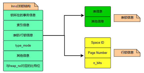 那么这么多次的锁结构,它到底是怎么组成的呢? 主要是由6部分组成的。分别为:锁所在的事务信息、索引信息、表锁或行锁信息、type_mode、其他信息、与heap_no对应的比特位。如下图所示: