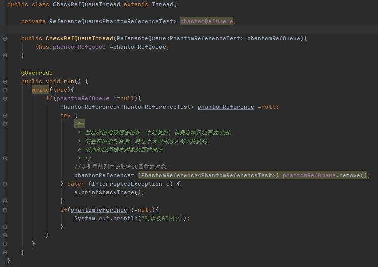 - 如果对象持有虚引用,其实与没有引用是一样的。虚引用必须和引用队列在一起使用,它的作用是用于跟踪GC回收过程,所以可以将一些资源释放操作放置在虚引用中执行和记录。