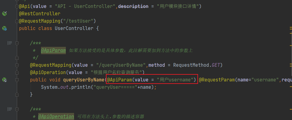 public void queryUserByName(@ApiParam(value = "用户username") @RequestParam(name="username",required = false, defaultValue ="tom" ) String name){