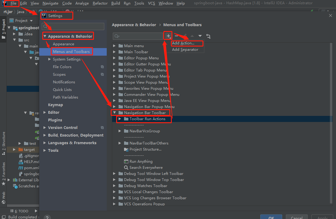 1、【File】—>【Settings】—>【Appearance & Behavior】—>【Menus and Toolbars】—>【Navigation Bar Toolbar】—>【Toolbar Run Action】—>【+】—>【Add Action…】,步骤如下图: 2、在弹出的【Choose Actions To Add】窗口中,依次选择【Main menu】——>【Back】,点击【OK】按钮。即可在工具栏添加上一步按钮。,如下图: