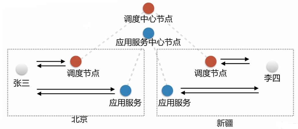 GSLB图解:下图中张三位于北京,请求服务时不是直接向应用服务中心节点发送请求,而是直接请求北京的应用服务;同理李四请求新疆的服务器,此图解将用户的请求定向到最近的区域,此图解就是一个全局负载均衡。