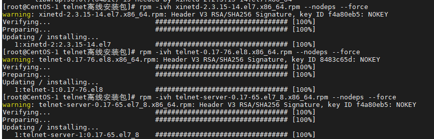 [root@CentOS-1 /]rpm -ivh telnet-0.17-76.el8.x86_64.rpm