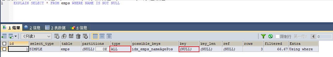 EXPLAIN SELECT * FROM emps WHERE NAME IS NOT NULL