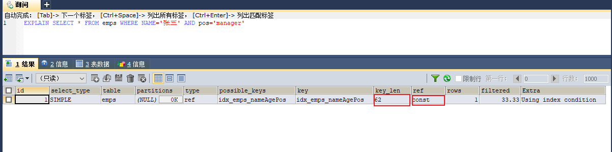 - 结论: 以上3种情况type 都为ref,说明性能不错;key为idx_emps_nameAgePos说明实际中用到了索引;ref为三个const说明用到了三个常量索引。