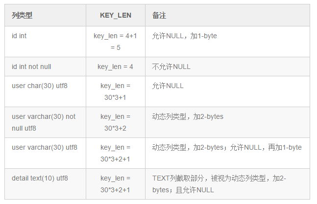 - 表示索引中使用的字节数,可通过该列计算查询中使用的索引的长度。在不损失精确性的情况下,长度越短越好;
