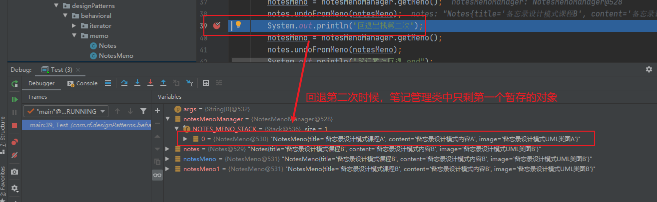 7、回退第二次开始的时候,笔记管理类中还剩1个对象,如下图: