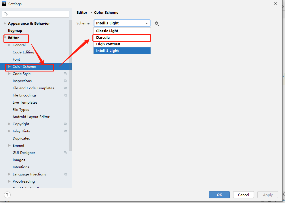 2、左侧树结构依次点击【Editor】——>【Color Scheme】,右侧Scheme属性的下拉框选择【Darcula】,如下图:
