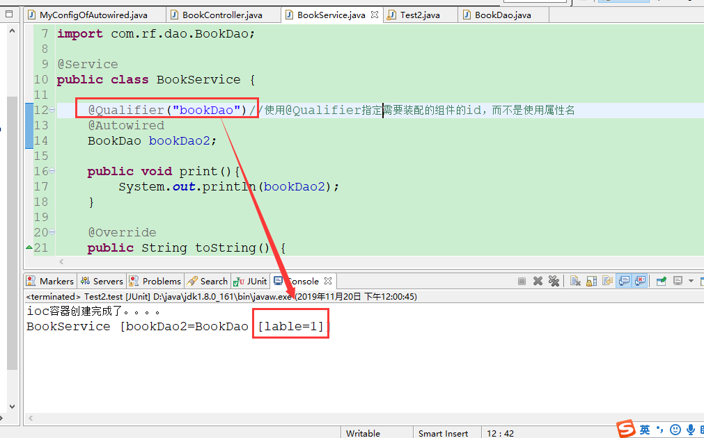 @Qualifier("bookDao")//使用@Qualifier指定需要装配的组件的id,而不是使用属性名