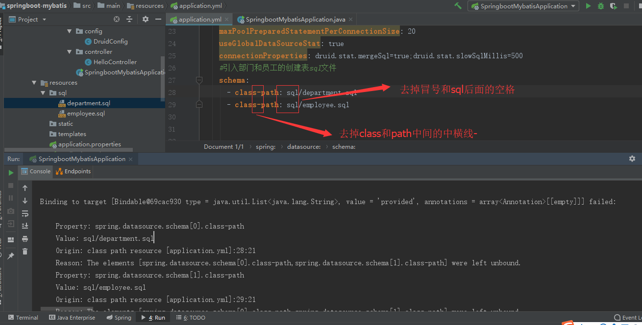 Reason: The elements [spring.datasource.schema[0].class-path,spring.datasource.schema[1].class-path] were left unbound.