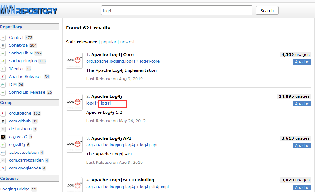 1、根据报错信息,配置文件pom.xml文件中缺少log4j配置,引入log4j配置即可,访问maven仓库地址,搜索log4j,如下图: