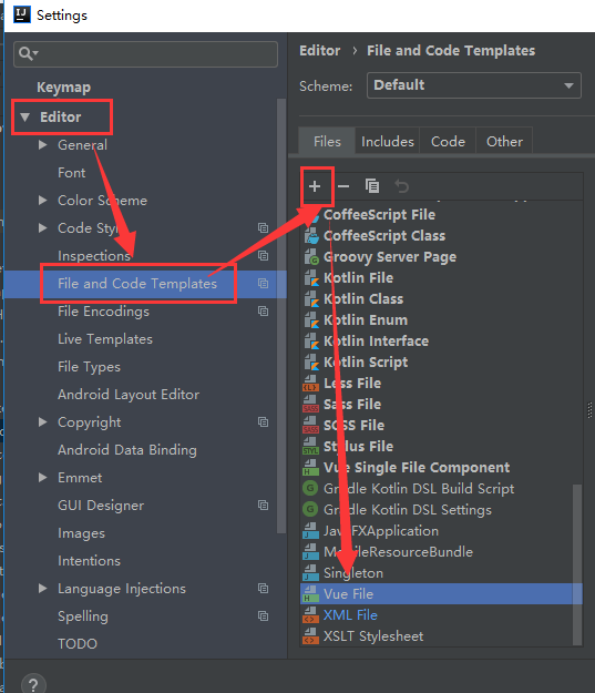 1、File——>Settings——>Editor——>File and Code Templates——>【+】——>填写【Vue File】